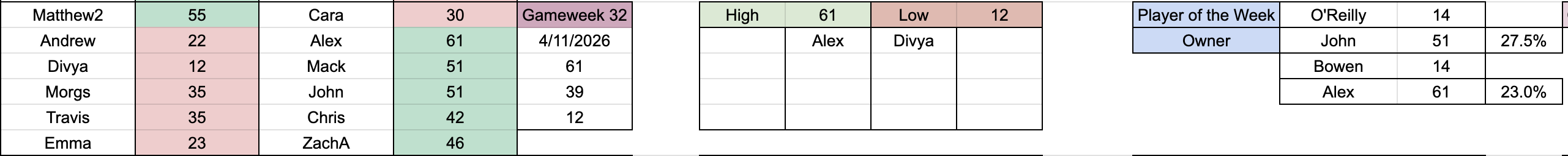 Hello everyone and welcome to double gameweek 33! Waivers this week are due Friday at 3:00am PDT / 6:00am EDT! Some pretty standard results this week, ;led by John fending Morgs off by a score of 51-35 and Chris picked up all 3 points against Travis, 42-35. Full results are as follows: