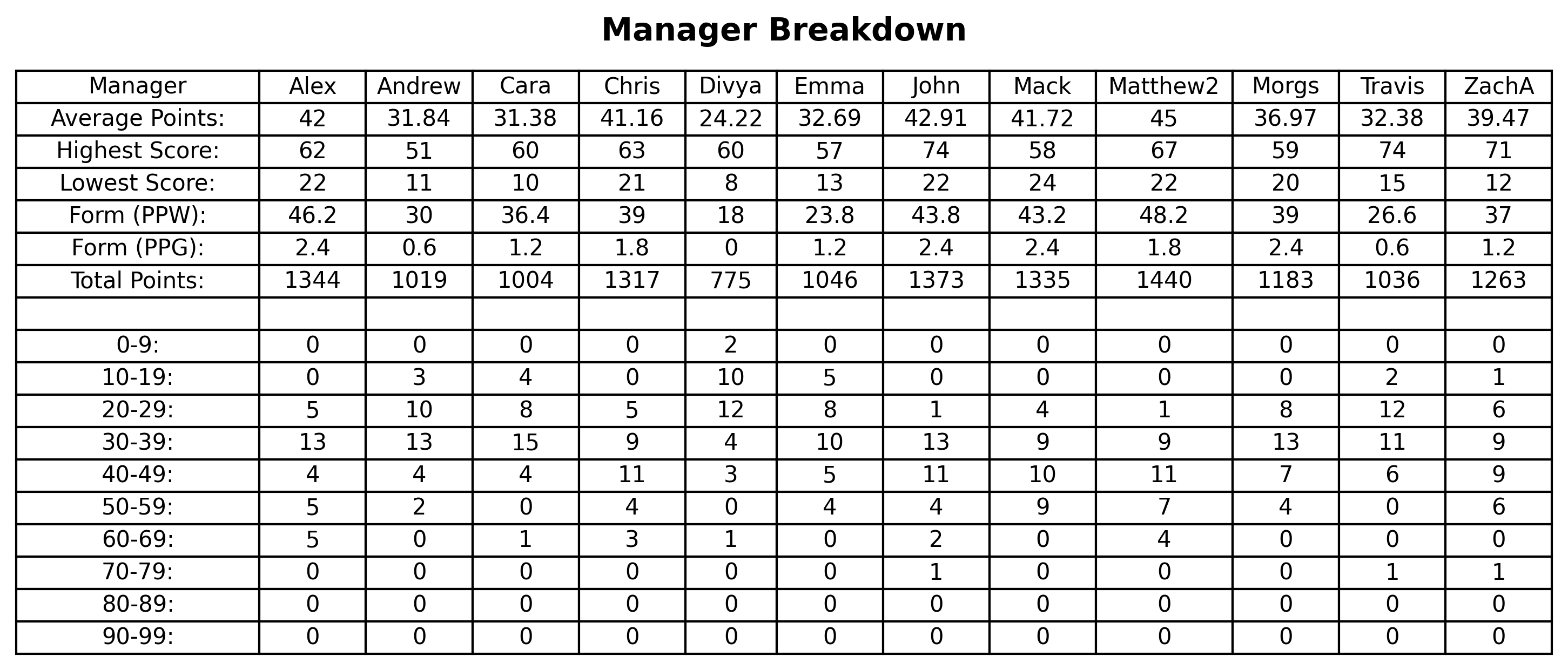 5 - Darryan (-3) - League A - Last 5: 43 (W), 65 (W), 34 (L), 28 (L), 32 (L) - 3 losses in 3 and not a score over 34 since his 65 pointer definitely puts some question marks around Darryan's title chances in the run in. That said, if he can figure out his bench, Xhaka, Scott, Rodri, and Haaland ahead of a couple Arsenal defenders and Kelleher seems like it could be enough to take him to the promised land (if he can beat Zach in their head to head).