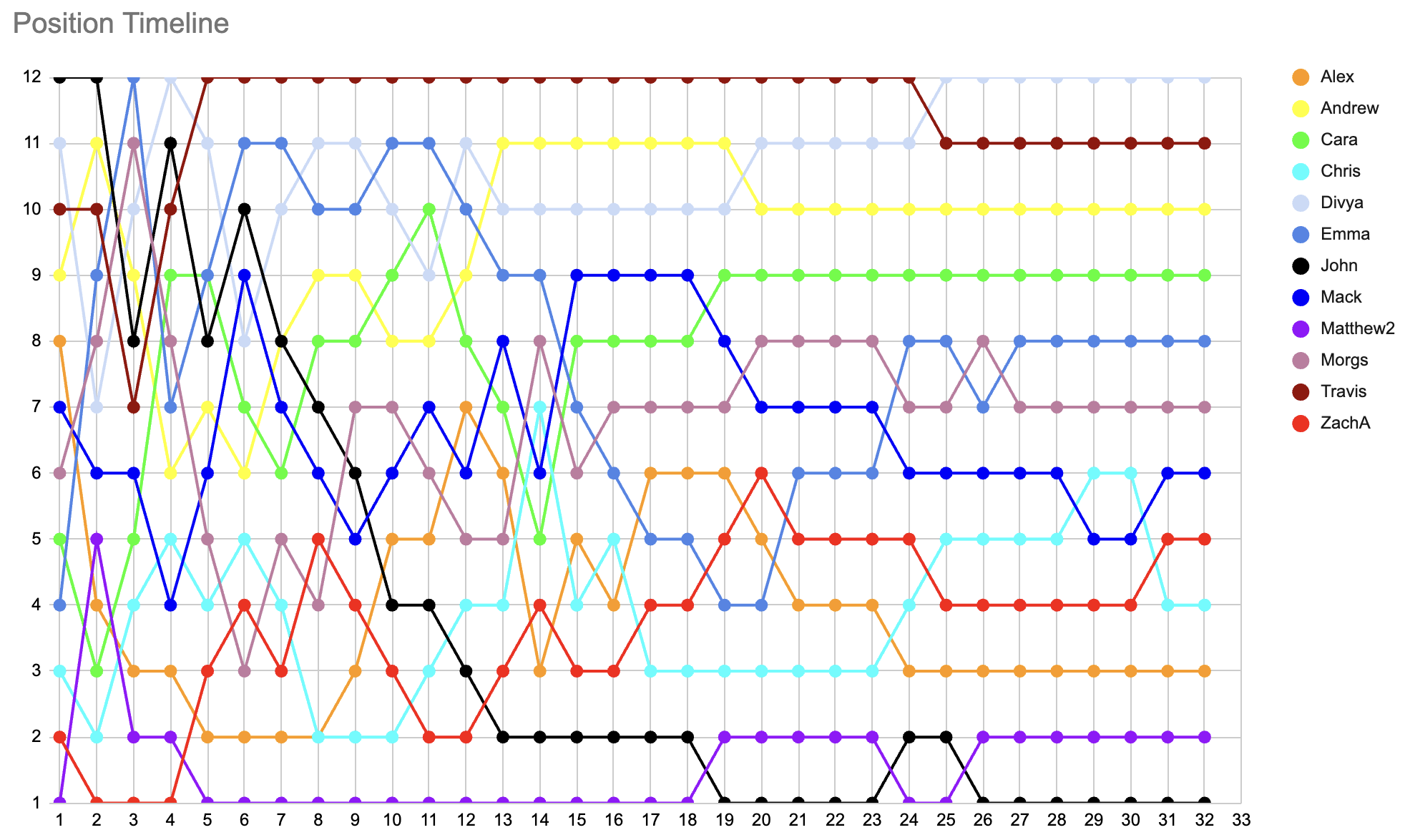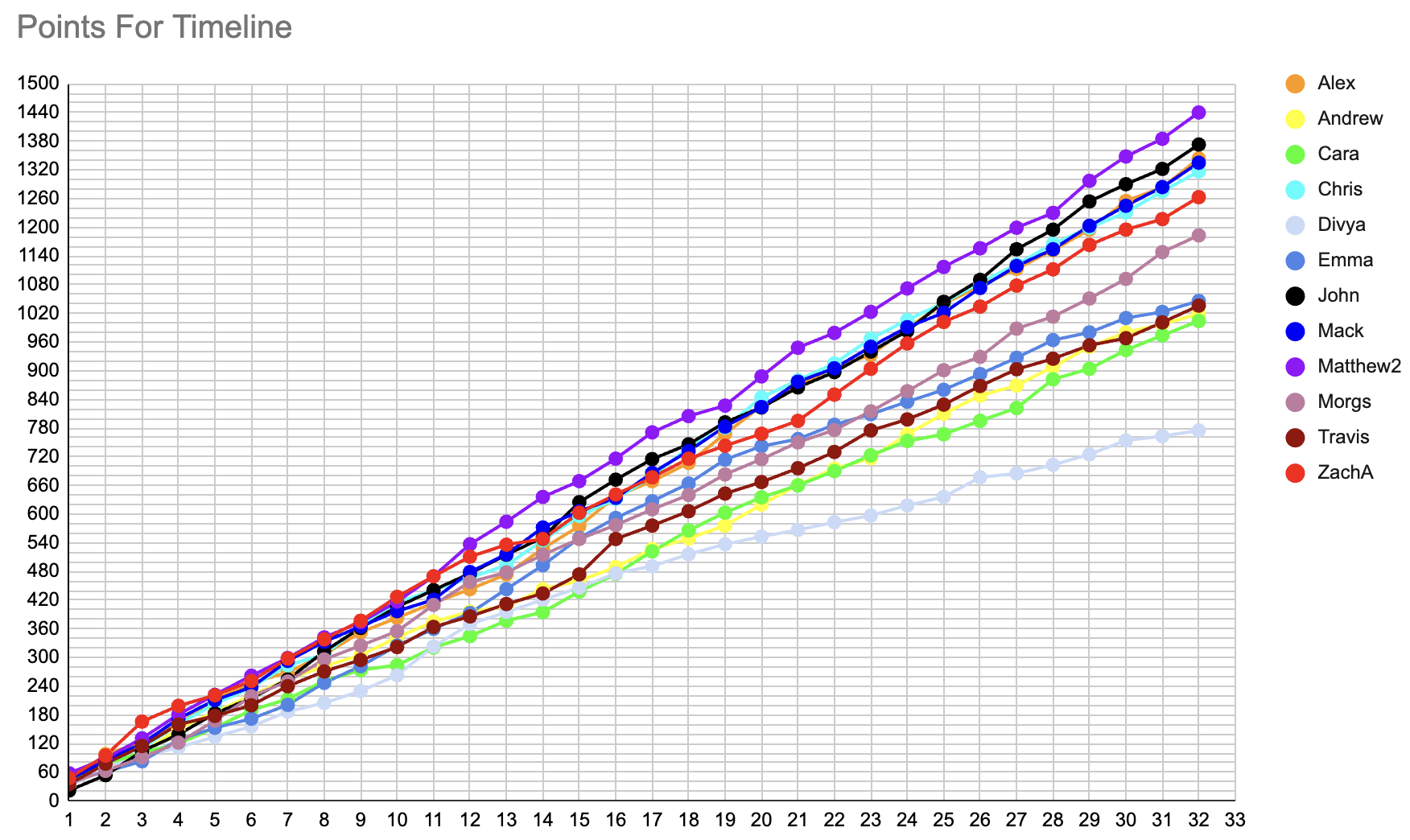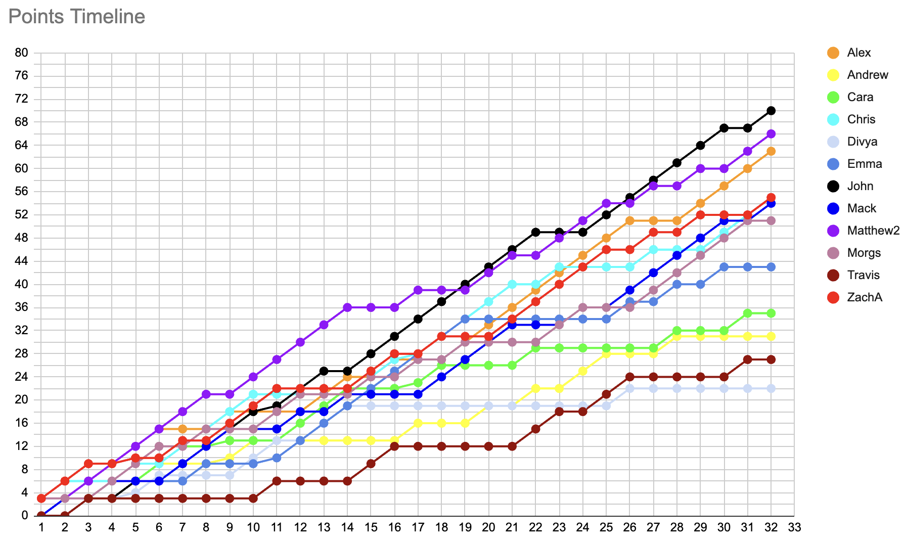 And similarly, not a lot changing on the table either (but we'll go over it anyway!). Starting at the top, John keeps his spot at the head of the table by 4 points over me. I remain 3 points above Alex, who is still 8 above Chris and ZachA. That duo is 1 point ahead of Mack, who is now 3 points ahead of her sister.