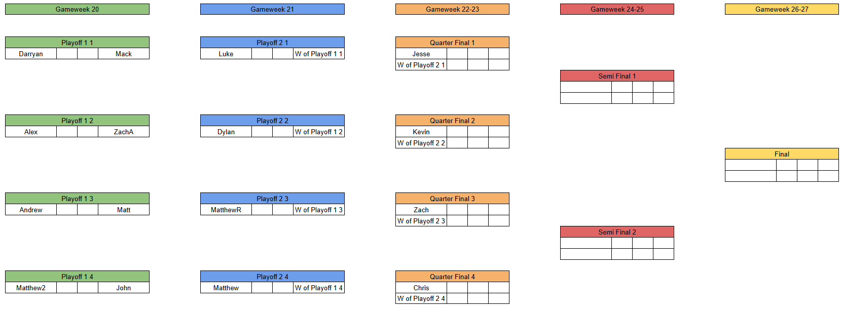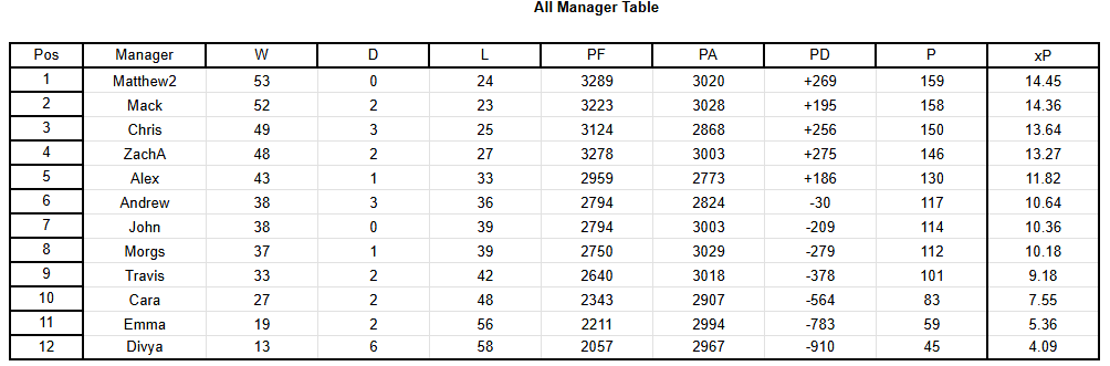 And as for the table, Jesse has secured his spot in the top 4 with his win as the only undefeated team! He is followed by just 3 managers on 18 points who can each confirm their spots with a win this week. Those managers are Zach, Chris, and Kevin. Dylan and MatthewR fall down into the 5th-8th section, now even on points with myself and relying on a loss from one of the 3 mentioned earlier to move into the top 4. Just below is Luke, who sits on 13 points, 1 point ahead of Darryan, Alex, and Andrew who are just outside of the top 8. My second team, John, and Matt fill in the middle spots of the 9th to 16th group on 10 points, and ZachA and Mack sit precariously in the final 2 positions on 9 points. However, the two are likely safe, as the 17th placed manager must win and overcome a 43 point PF deficit to qualify for the knockout rounds. That means, unfortunately, that the following teams are eliminated, or likely to be eliminated: