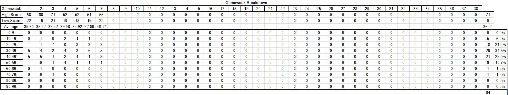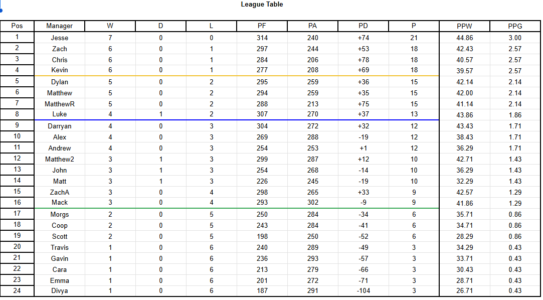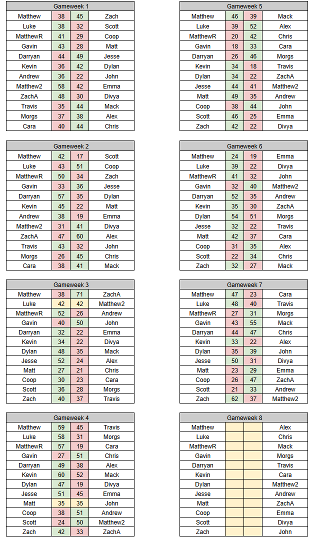 Welcome to gameweek 8 of The League(tm) group stage! We are now in the final gameweek, so after this week we will have to say goodbye to 8 of our closest friends. Anyway, some highlights from this week's slate of games include Chris's narrow 47-44 victory over Darryan, Morgs's 31-27 upset over MatthewR, John taking a big 3 points in a 39-35 win against Dylan, and Luke picking up an important high scoring win 48-40 against Travis. Full results are as follows: