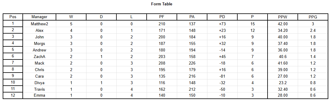 In terms of form, I sit on top with 15/15 points earned! And just behind me on 12/15 points in the last 5 weeks is Alex!