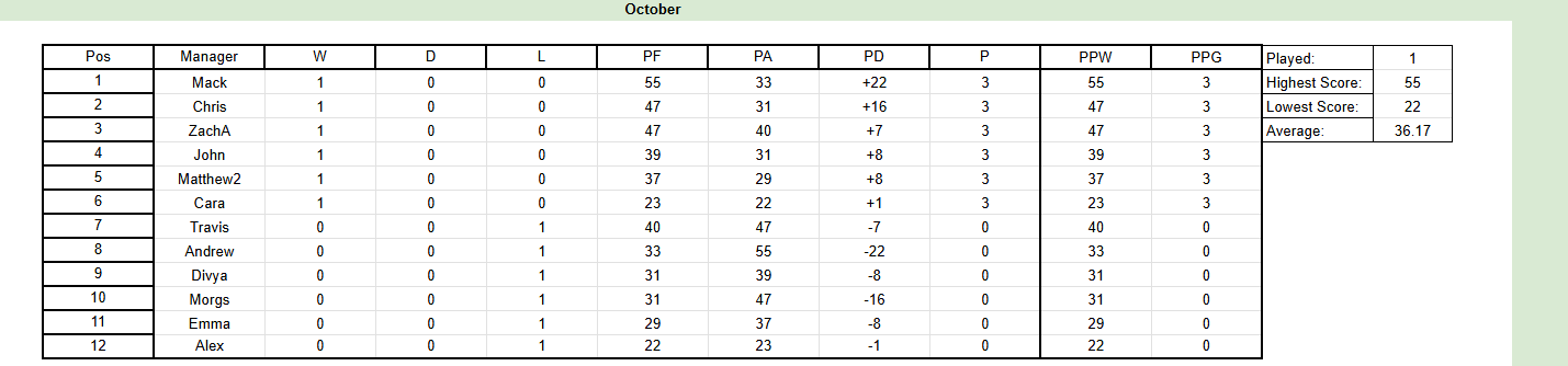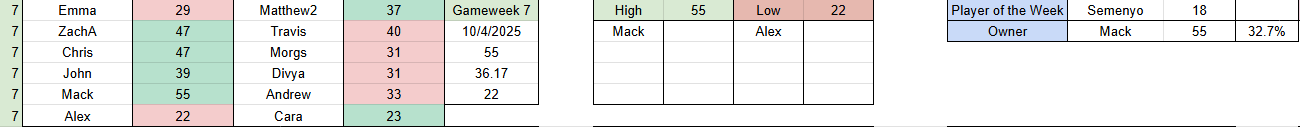 Hello everyone and welcome to gameweek 8 and our second international break of the season! Waivers this week are due Friday at 3am PDT / 6am EDT! Highlights from this week are led by the wild upset by Cara over Alex in the 23-22 shootout! Elsewhere we saw ZachA fend off Travis 47-40, Chris pick up an important 3 points in a 47-31 win against Morgs, and Mack putting up a week-high 55 points to defeat Andrew's 33. Full results are as follows: