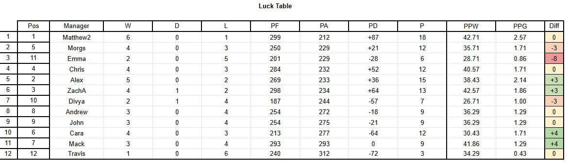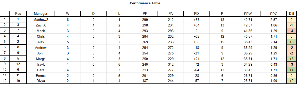 This week will see some great matchups, headlined by a 1st vs 2nd matchup between myself and Alex! Elsewhere, ZachA and Morgs each hope to close the gap on the league leaders with a win against one another, Mack looks to knock Cara out of the top half with a victory this week, Andrew and John face off in a midtable battle, and Travis takes on Emma in what should be a good chance for each of them to get into the midtable swamp we have developing. Full matchups are as follows: