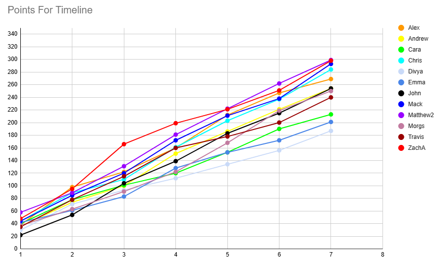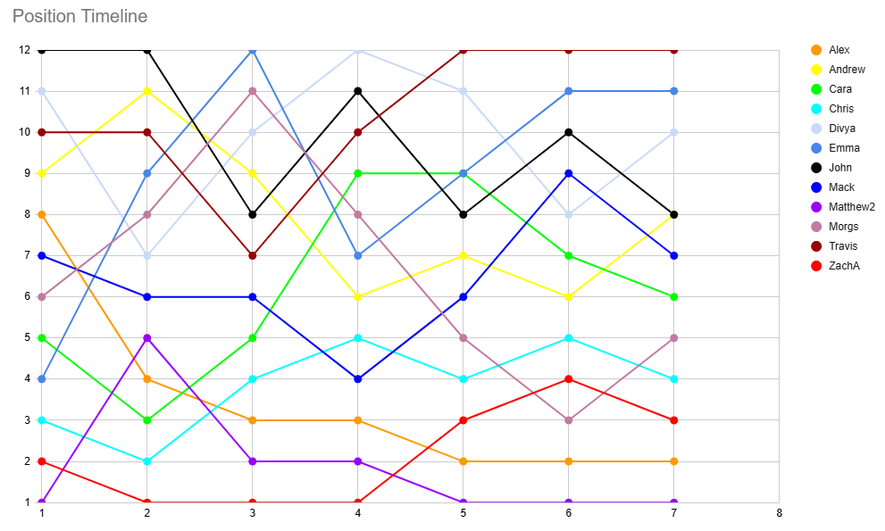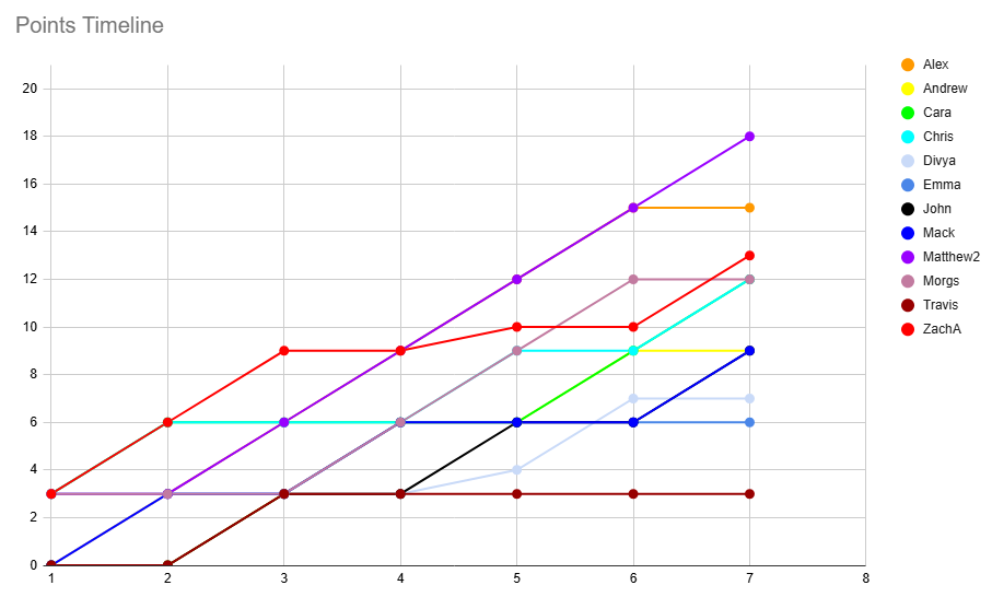 This week sees the top 2 remain the same, as I increase my lead to 3 points with Alex's loss. ZachA jumps up the board with his win, sitting just 2 points behind Alex. Chris and Cara's wins move them into the top half as well, sandwiching Morgs on PF and sitting just 1 point behind Zach. Further down, Mack's win pushes her to the top of the group on 9 points ahead of Andrew, who is now in a tie for 8th on PF with John, who has moved just ahead of Divya with his head to head win.